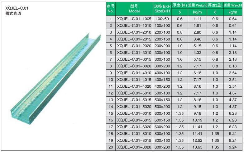 XQJEL_C.01槽式直通產品型號、規格、重量等參數及XQJEL_C槽式電纜橋架在不同跨距下允許均布載荷變形量。