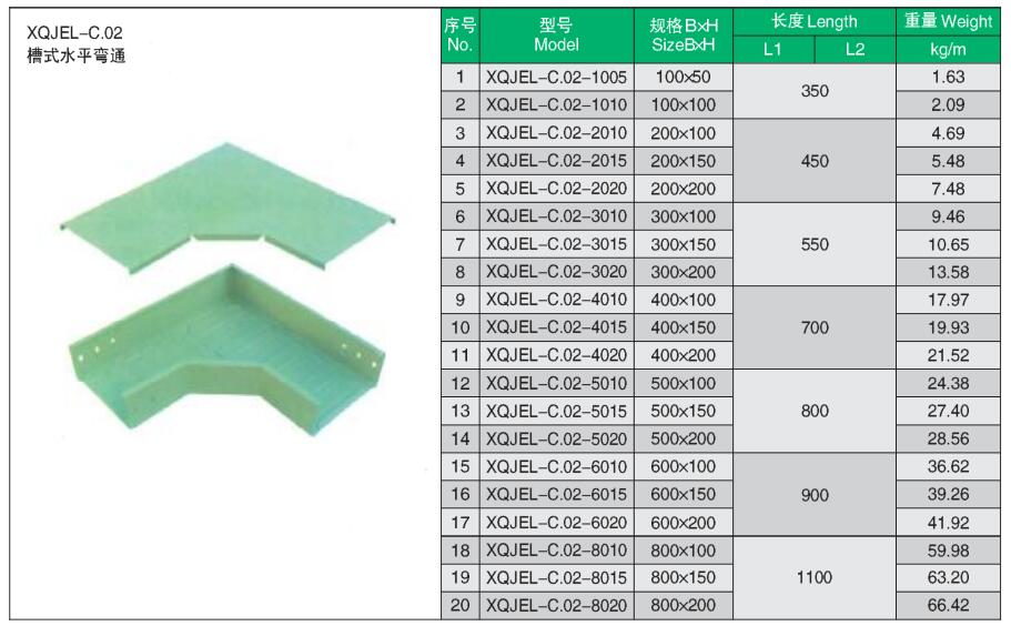 XQJEL_C.02槽式水平彎通產品型號、規格、重量等參數及XQJEL_C槽式電纜橋架在不同跨距下允許均布載荷變形量。