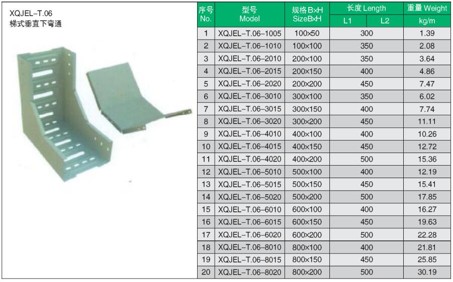 XQJEL_T.06梯式垂直下彎通產品型號、規格、重量等參數及XQJEL_T梯式電纜橋架在不同跨距下允許均布載荷變形量。